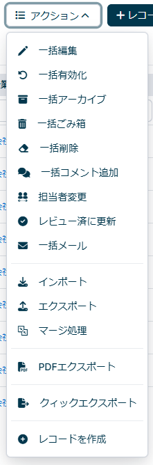 リストに対して一括でアクション(例えば、データの更新、削除、エクスポートなど)できる機能になります。